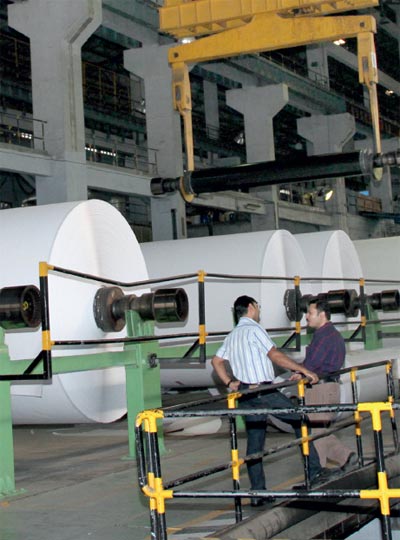 Productie van speciaalpapier en karton bij de fabriek van ITC in Sarapaka, Andhra Pradesh.