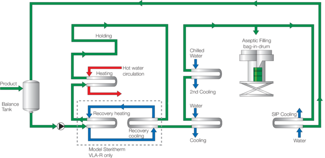 Voordat een product door het apparaat kan stromen, wordt de Steritherm VLA gedurende 30 minuten gesteriliseerd met oververhit water van 125 °C. Het product wordt via de balanstank door een pomp naar de eerste verwarmer verplaatst, waar het door circulerend heet water wordt verwarmd tot de juiste sterilisatietemperatuur. De daaropvolgende buisvormige cel zorgt dat het product lang genoeg wordt opgeslagen voor een effectieve behandeling.